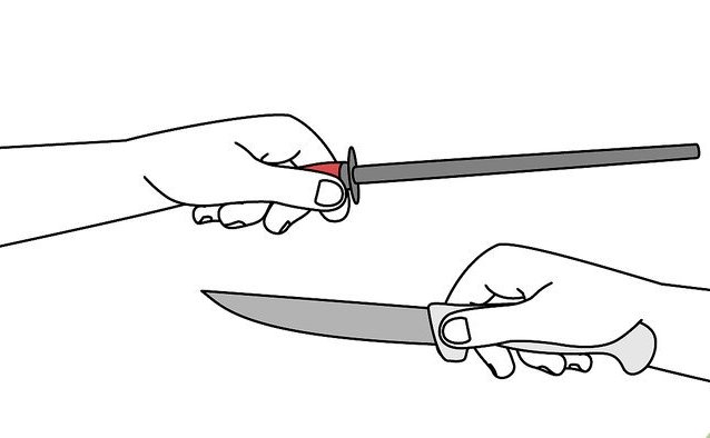 1. ถือแท่งลับมีดข้างที่ไม่ถนัด แท่งเหล็กควรถือในมุมห่างจากตัวปลายแท่งควรยกขึ้งสูงเหนือด้ามจับ